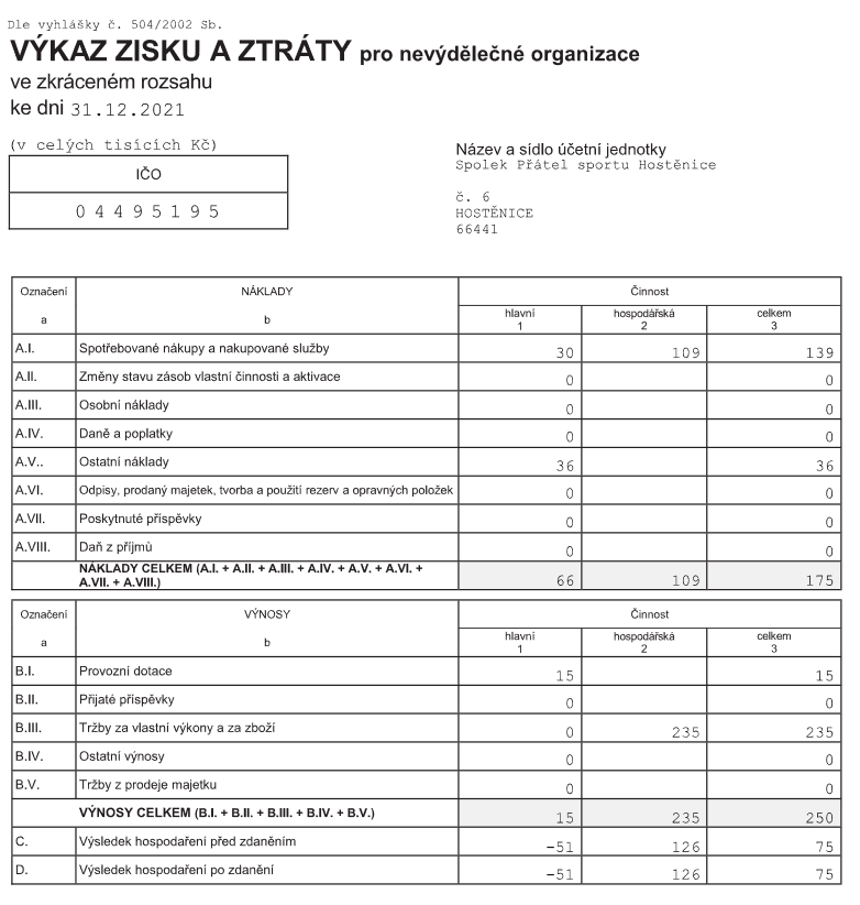 Hospodaření spolku za rok 2021: